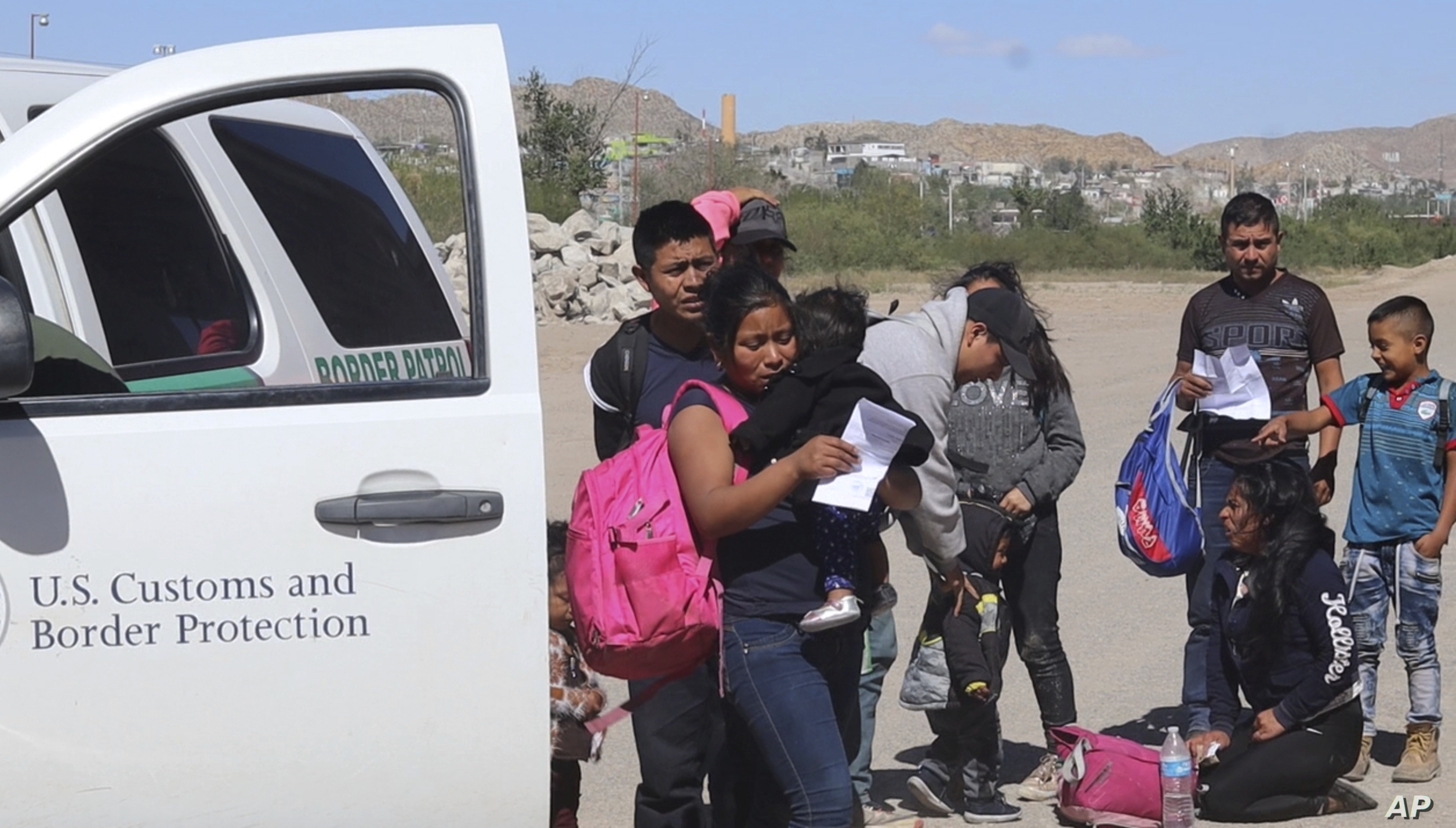 In this April 2019, frame from video, migrants turn themselves in to border agents in El Paso, Texas, after crossing the US – Mexico border.