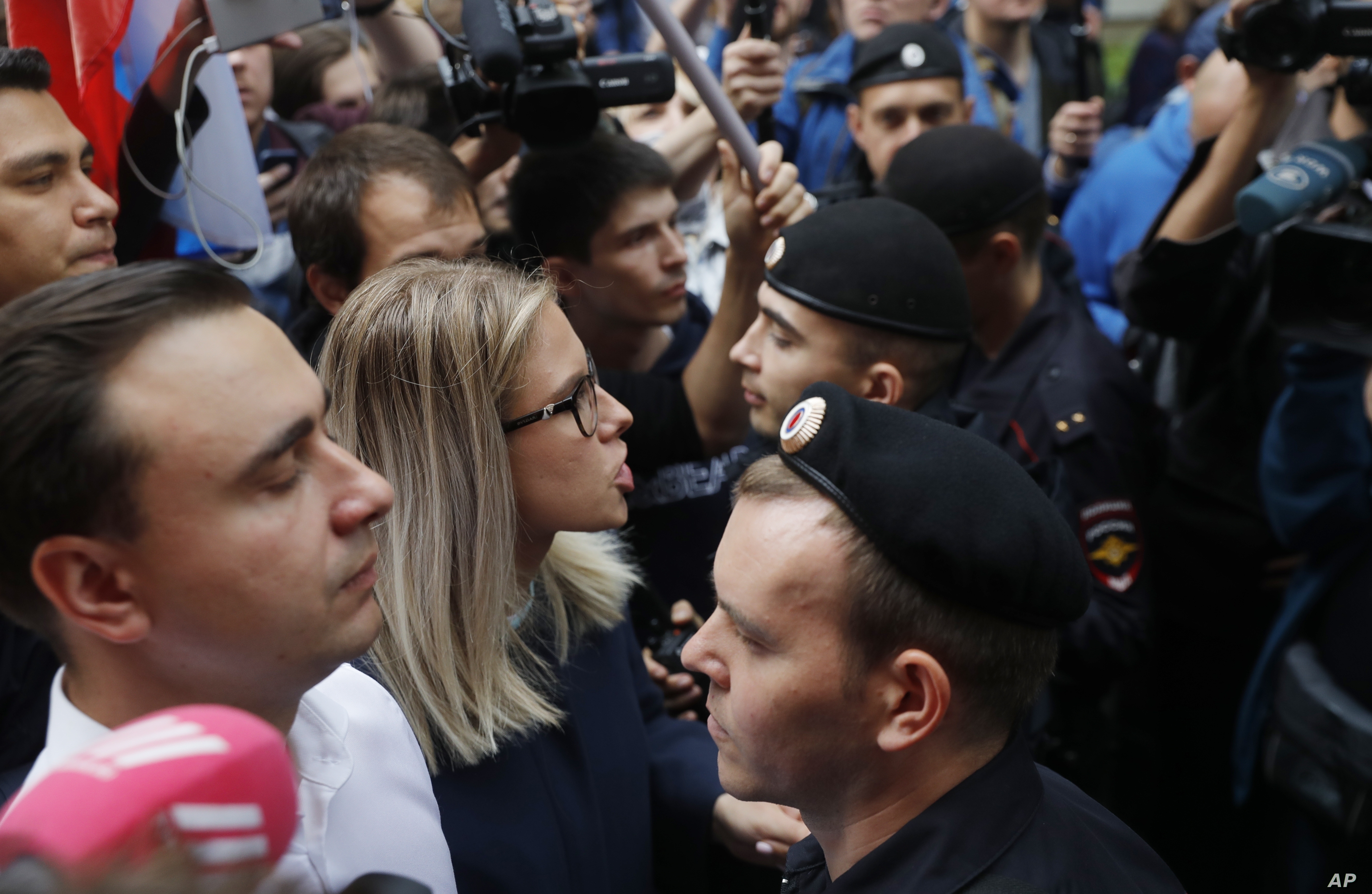 FILE – Russian opposition candidate and lawyer at the Foundation for Fighting Corruption Lyubov Sobol, center, and others stand in front of a police line during a protest in Moscow, Russia, July 14, 2019.