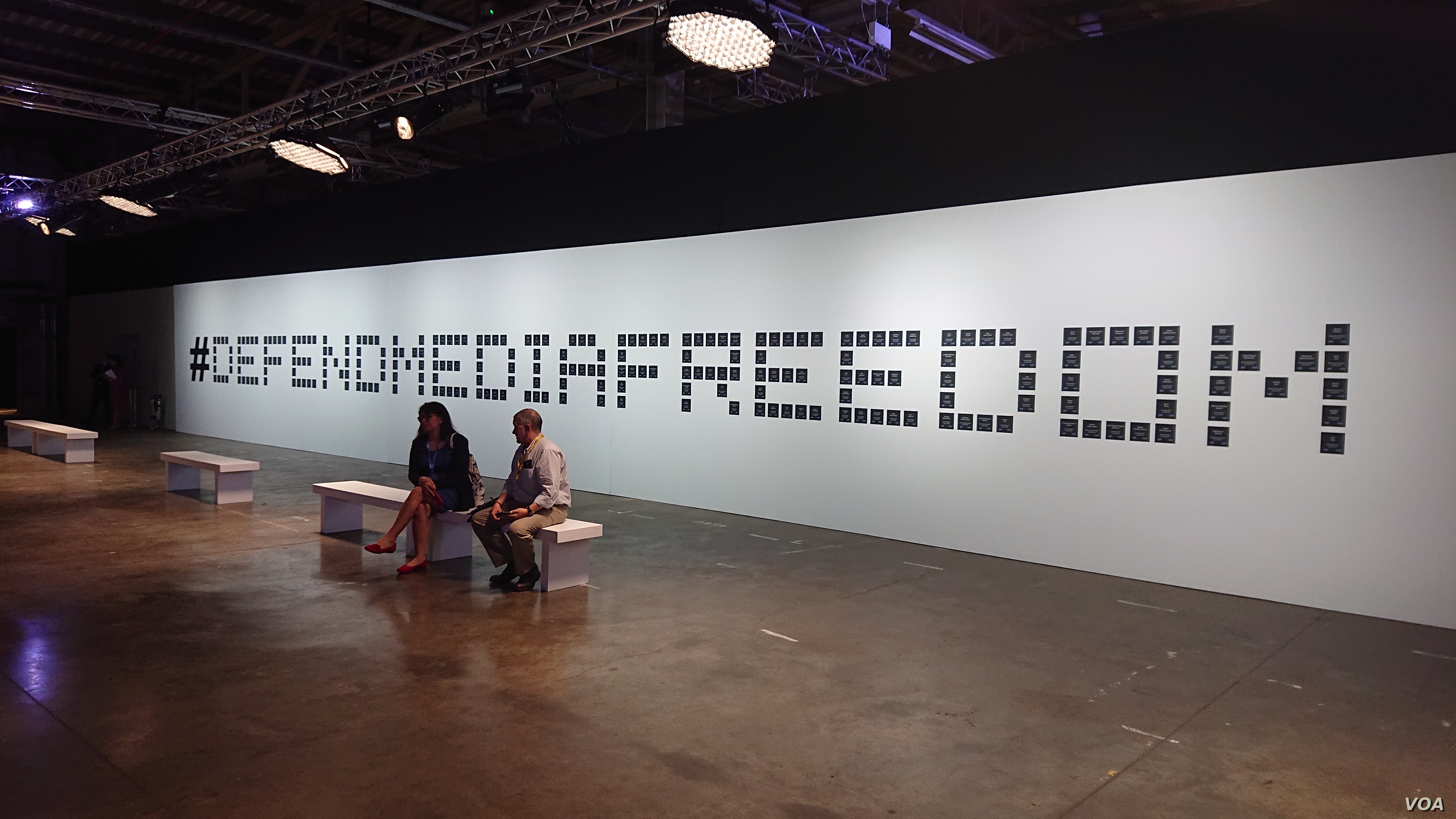 Two journalists relax in front of plaques memorializing journalists killed since 2016. The display was part of the Global Conference for Media Freedom.
