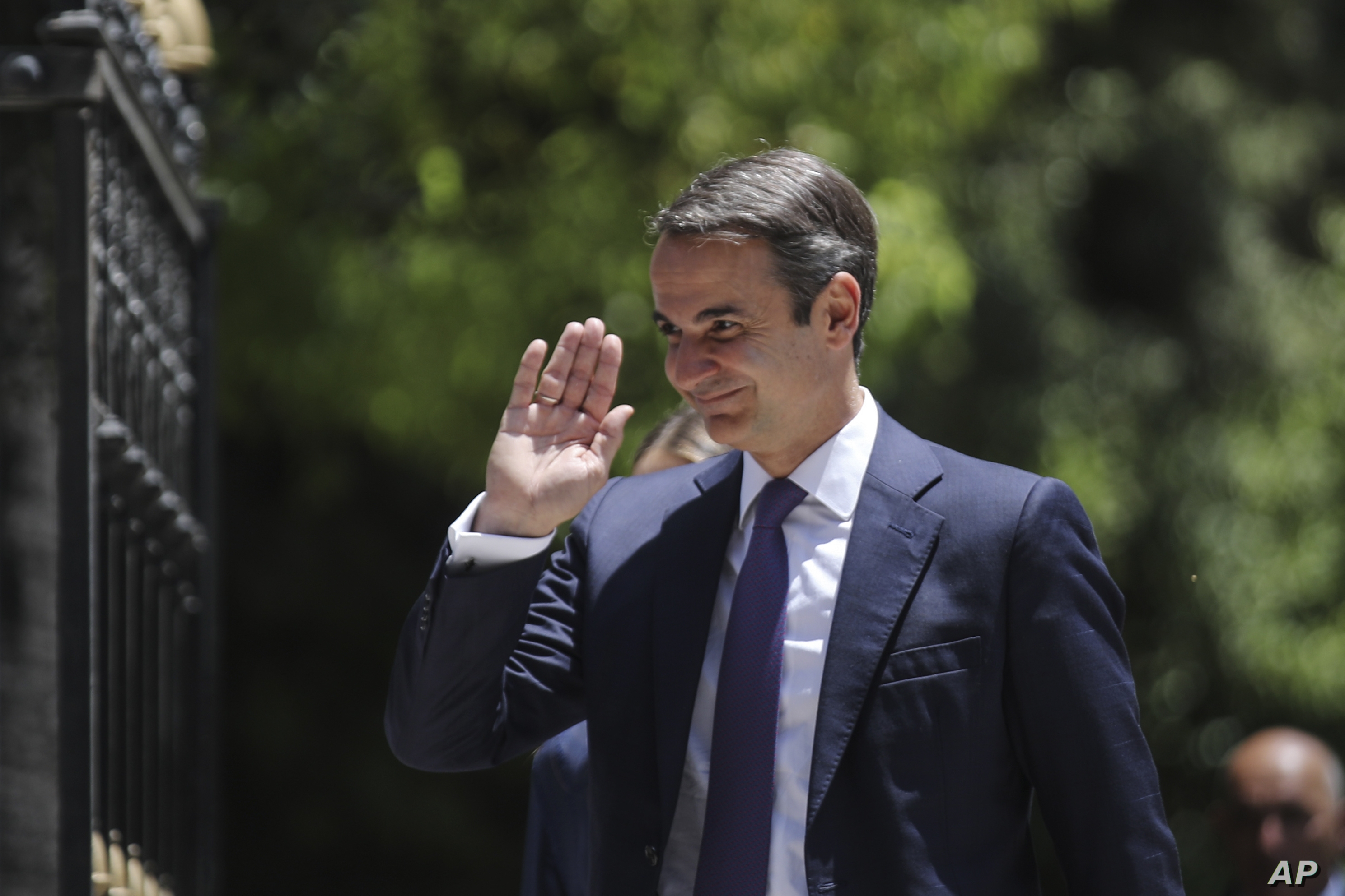 FILE – Greece’s newly-elected prime minister Kyriakos Mitsotakis, waves as he walks shortly after his swearing-in ceremony at the Presidential Palace in Athens, July 8, 2019.