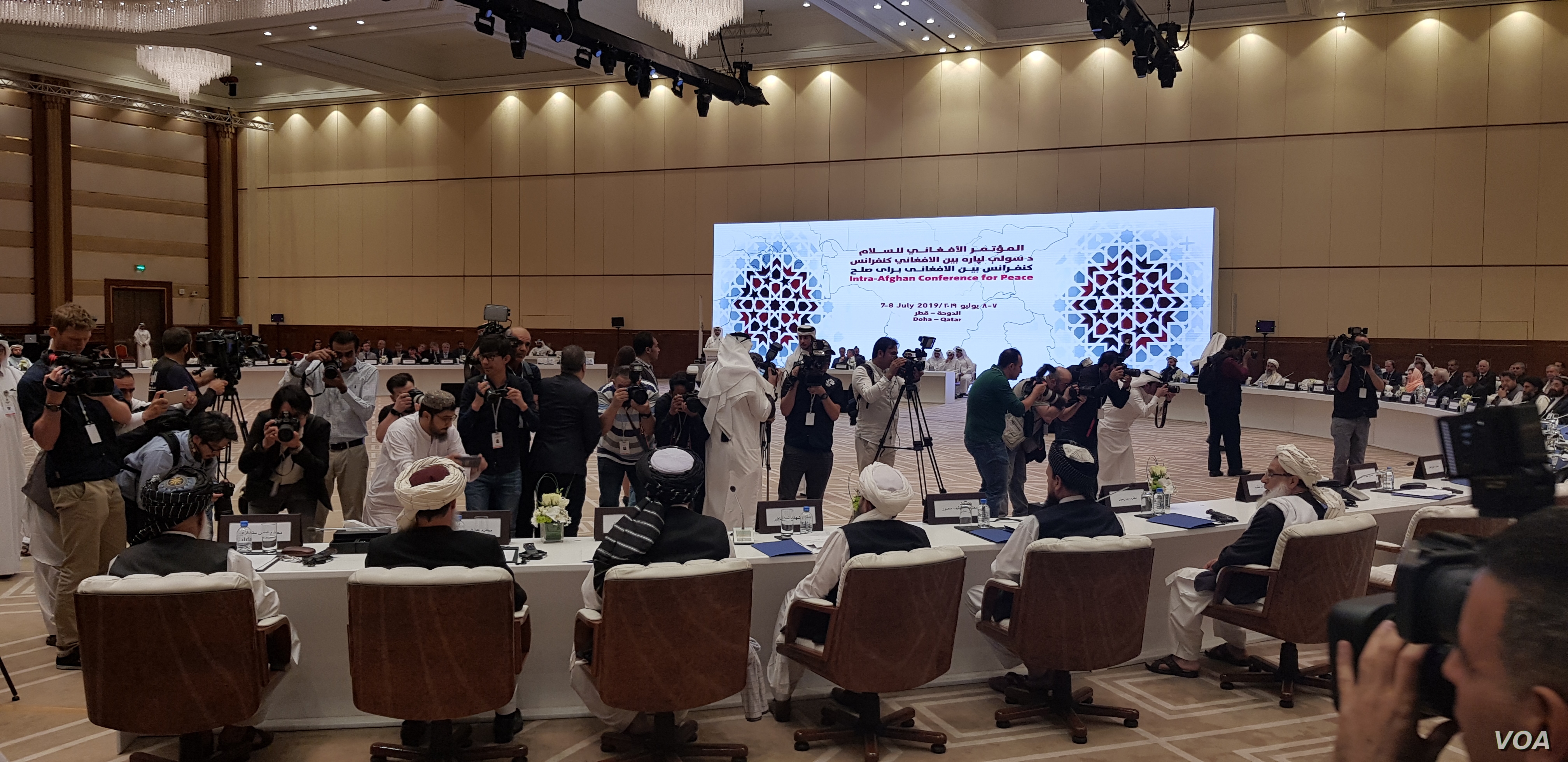 Media representatives were only allowed to briefly take pictures at the start of the intra-Afghan dialogue and was asked to leave before the opening statements, in Doha, Qatar, July 7, 2019. (A. Tanzeem/VOA)